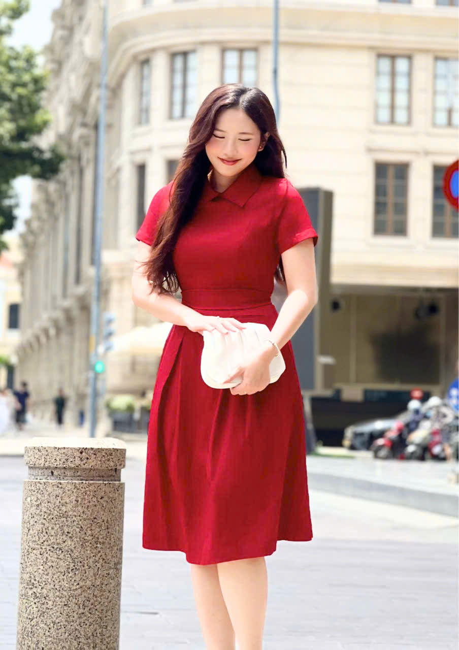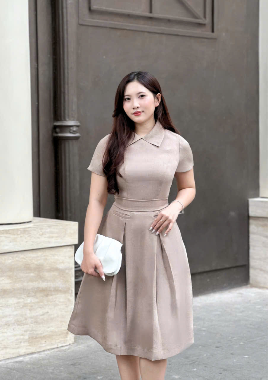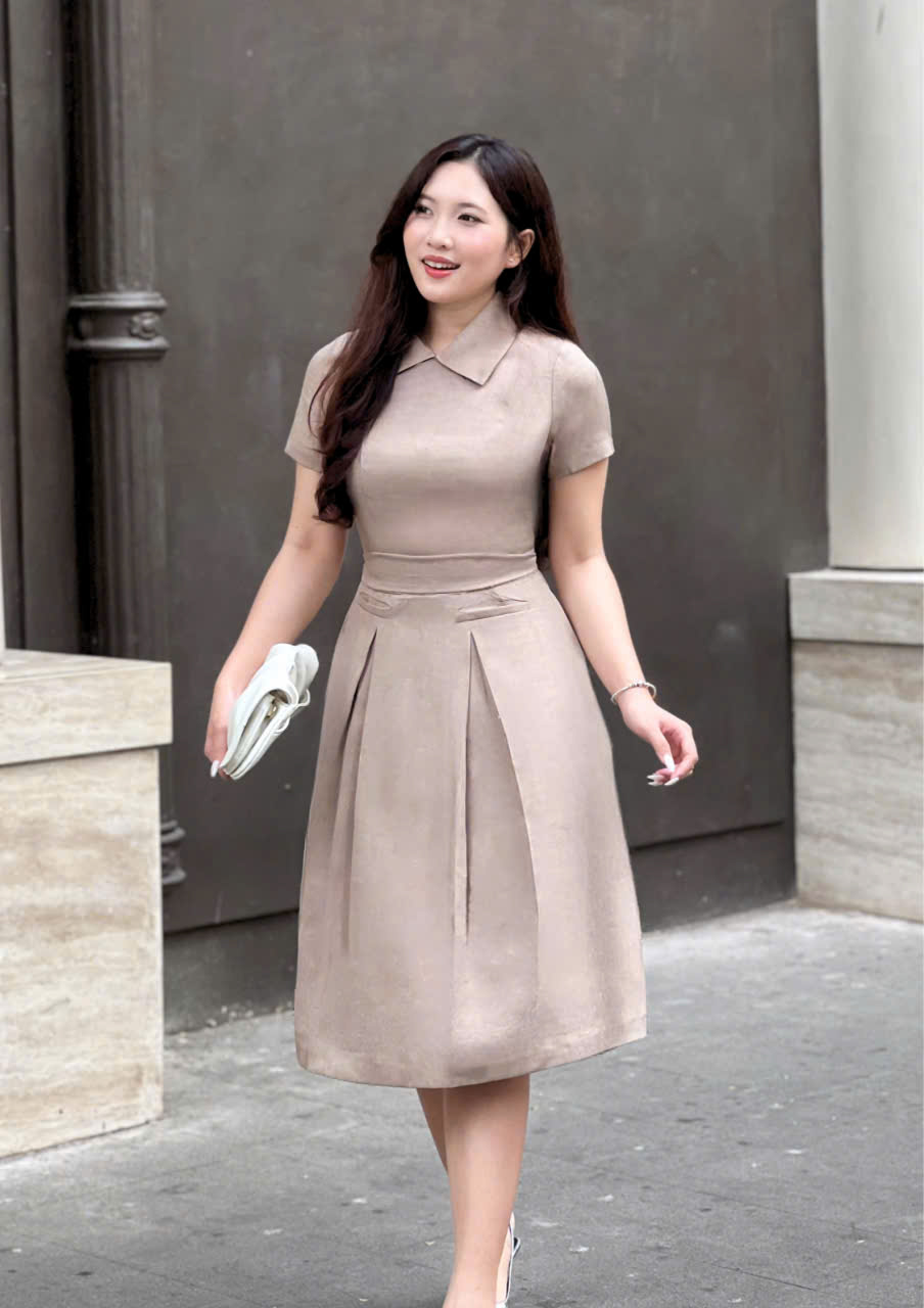 Form đầm ôm gọn phần thân trên, kết hợp chân váy xòe nhẹ với các nếp gấp ly đều, giúp tôn dáng và tạo hiệu ứng thon gọn một cách tự nhiên. Thiết kế cổ danton thanh lịch cùng tay ngắn kín đáo mang đến vẻ ngoài trang nhã, dễ ứng dụng trong nhiều hoàn cảnh.