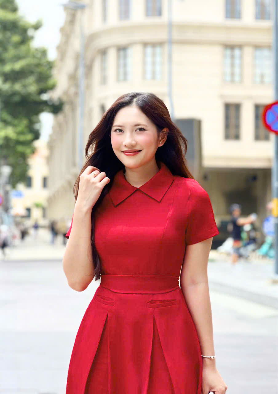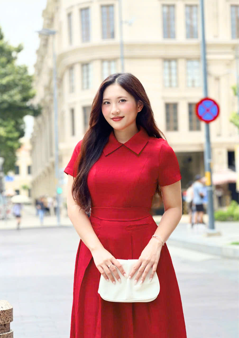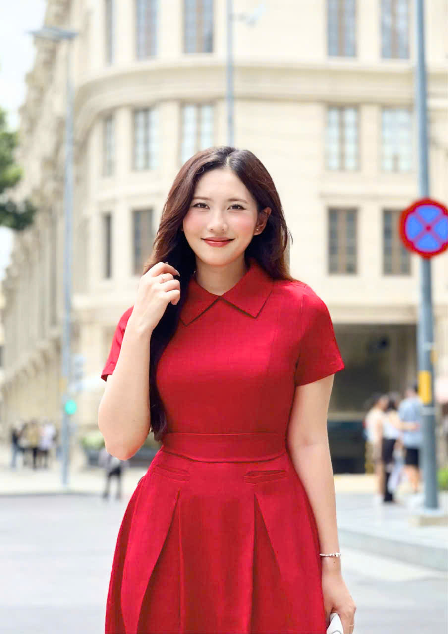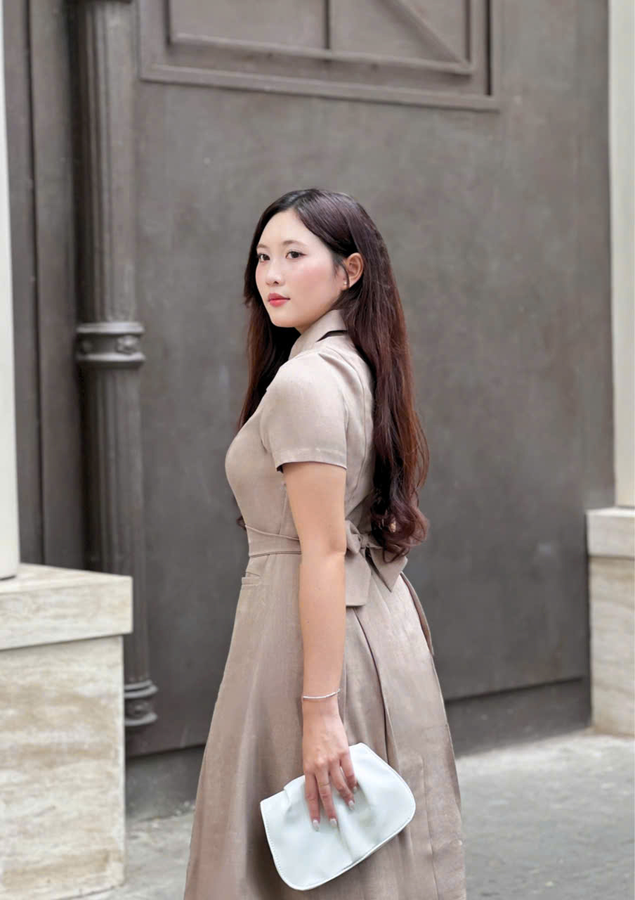 Form đầm ôm gọn phần thân trên, kết hợp chân váy xòe nhẹ với các nếp gấp ly đều, giúp tôn dáng và tạo hiệu ứng thon gọn một cách tự nhiên. Thiết kế cổ danton thanh lịch cùng tay ngắn kín đáo mang đến vẻ ngoài trang nhã, dễ ứng dụng trong nhiều hoàn cảnh.