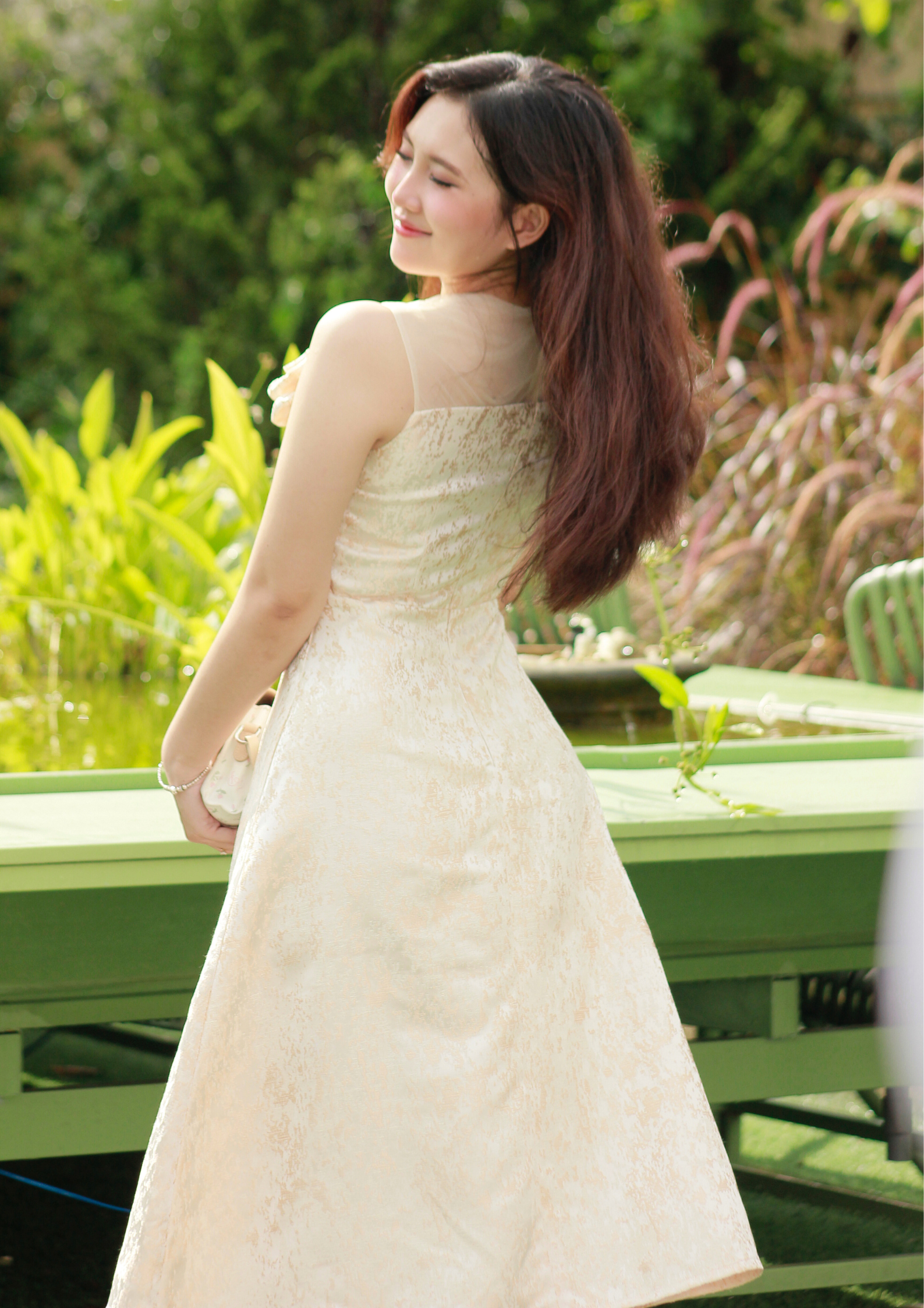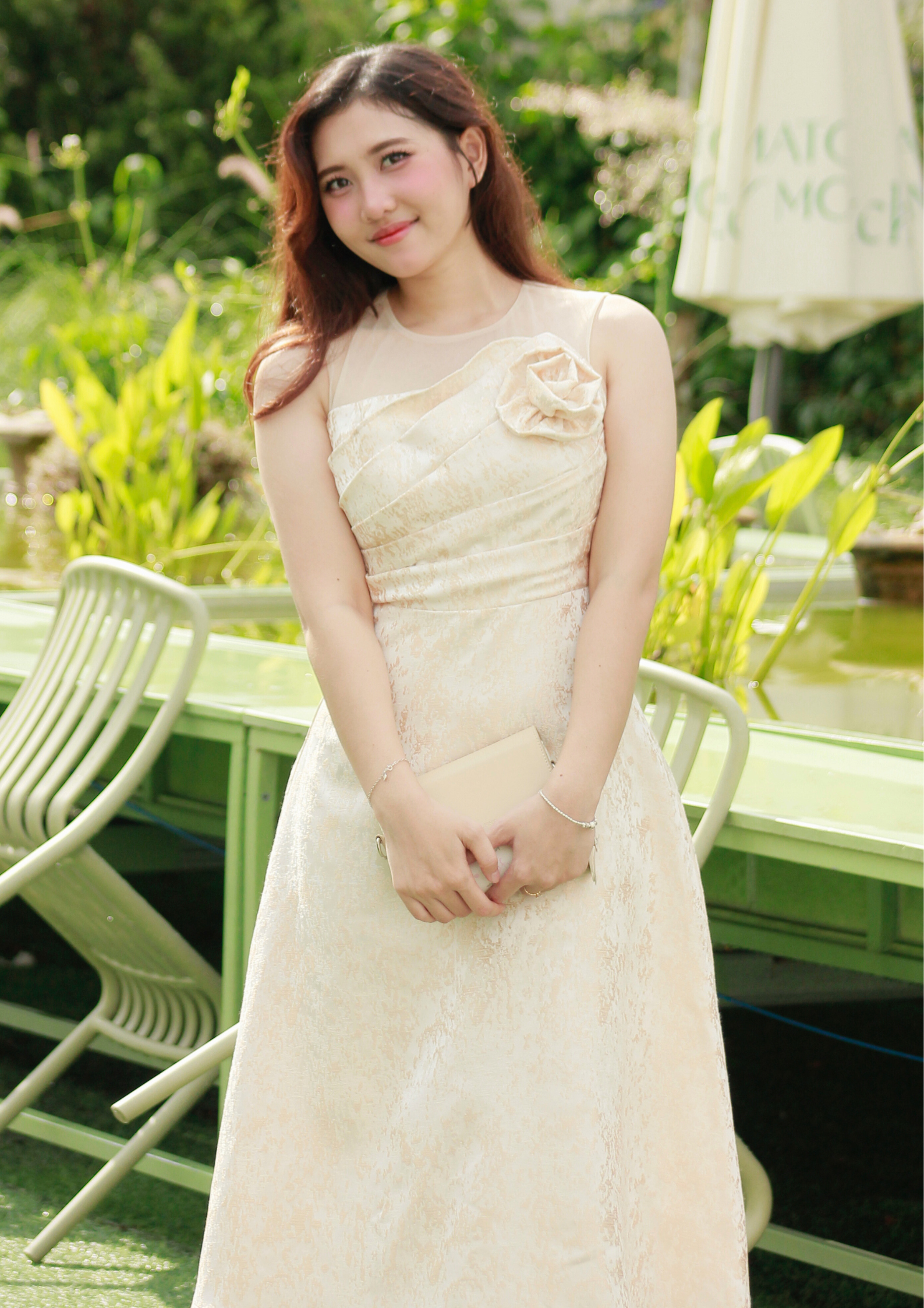 Chất liệu “Bloom Gleam Brocade – Gấm Hoa Ánh Kim” dệt hoa lớn, bề mặt khẽ bắt sáng, tạo hiệu ứng ánh sắc nhẹ và sang trọng trong từng chuyển động.