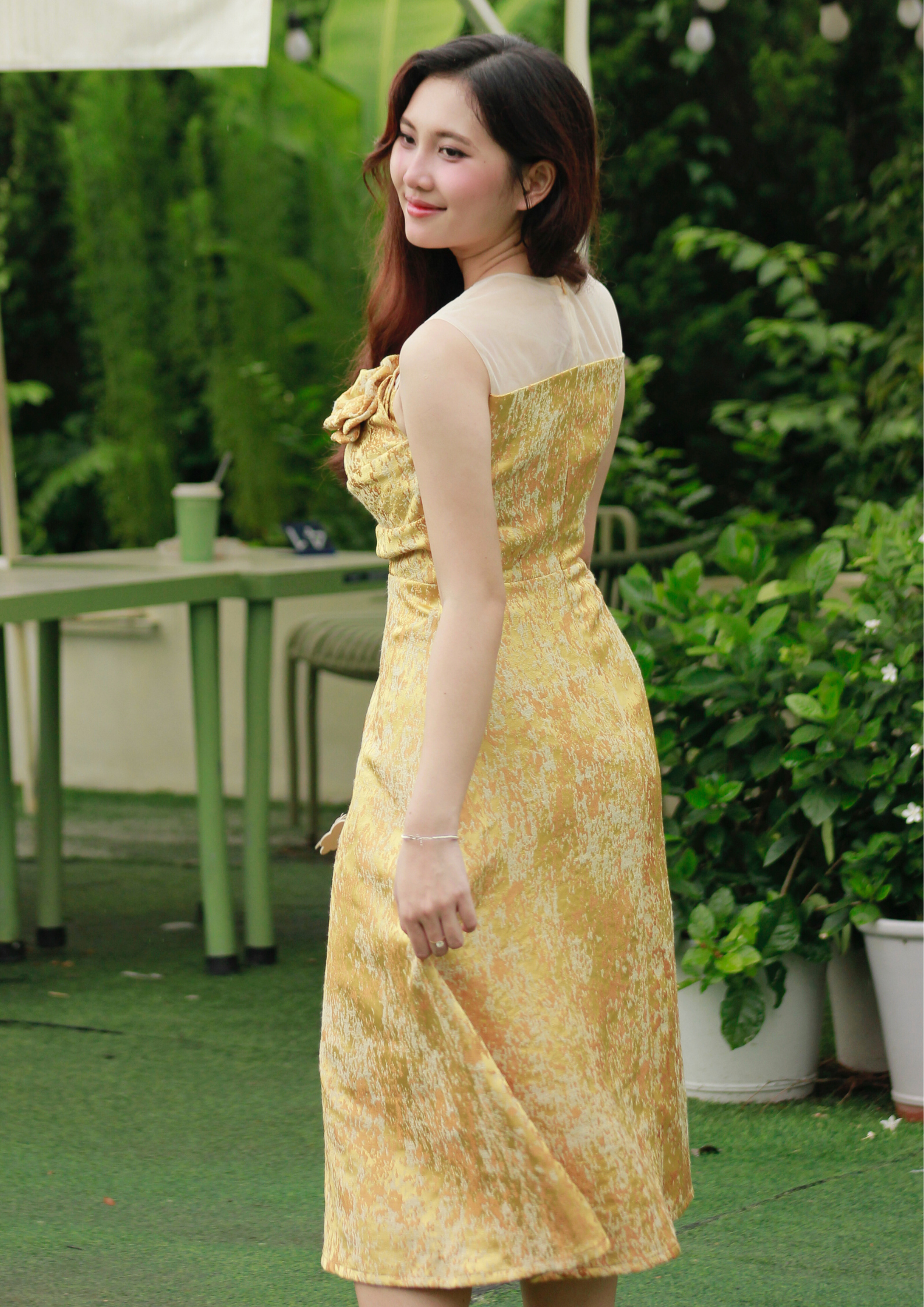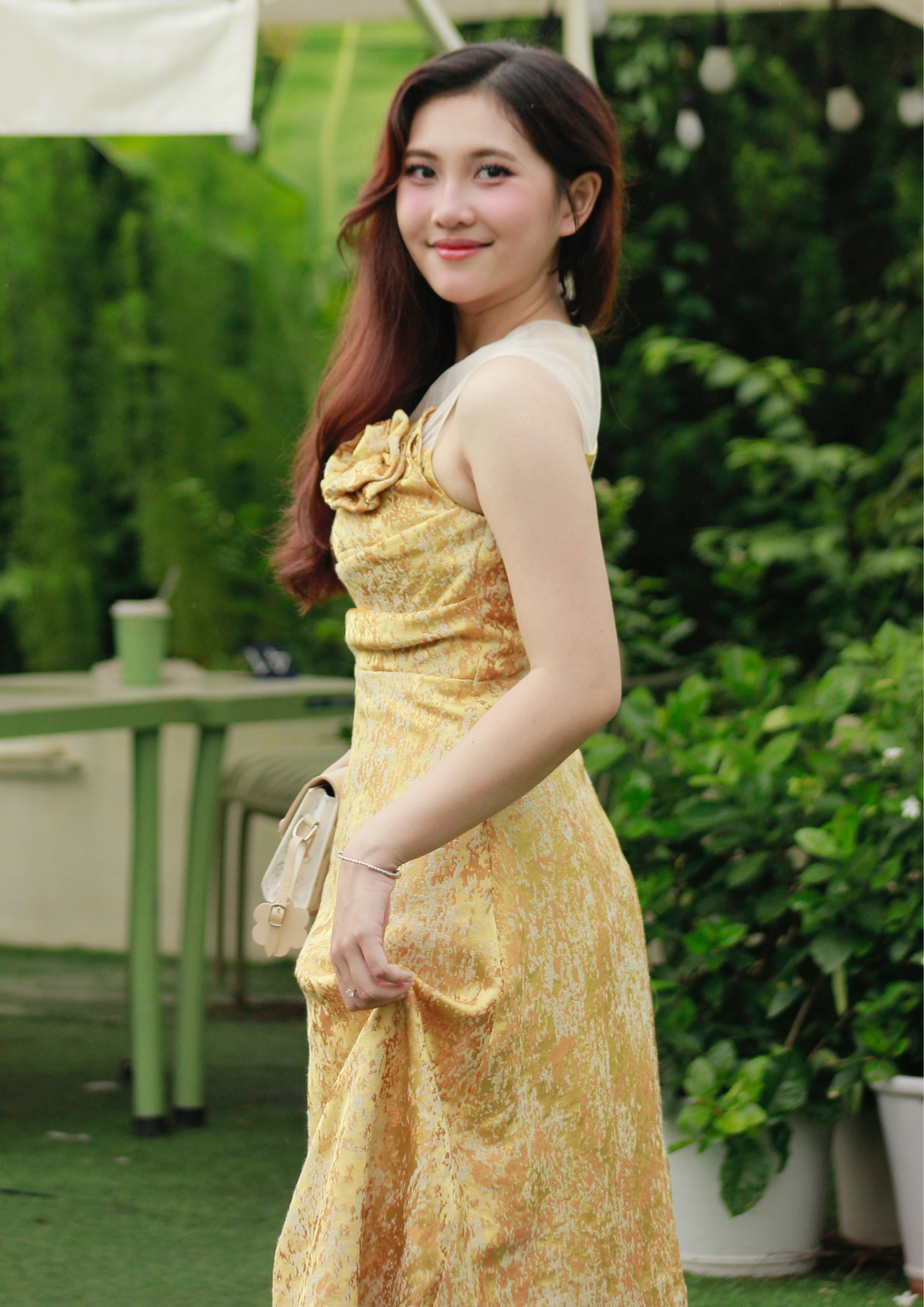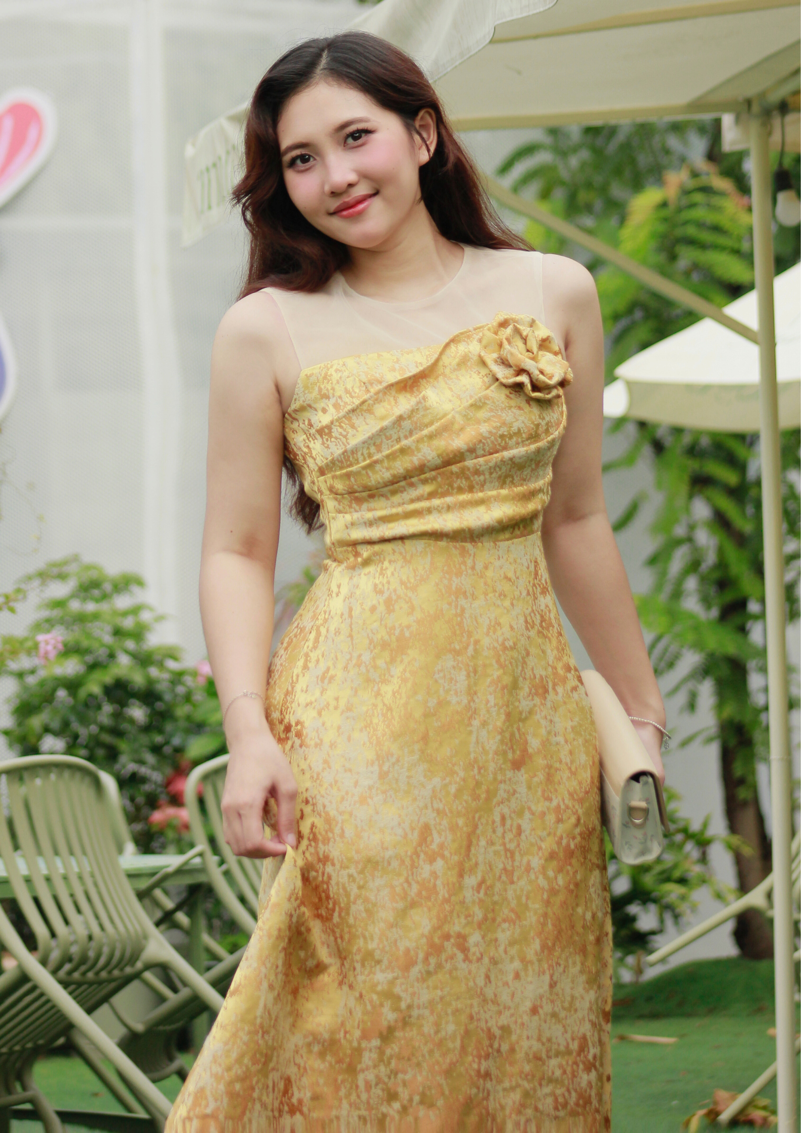 Chất liệu “Bloom Gleam Brocade – Gấm Hoa Ánh Kim” dệt hoa lớn, bề mặt khẽ bắt sáng, tạo hiệu ứng ánh sắc nhẹ và sang trọng trong từng chuyển động.