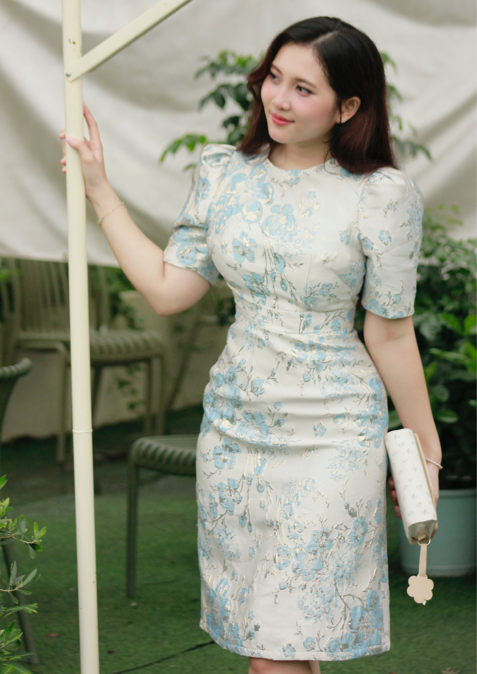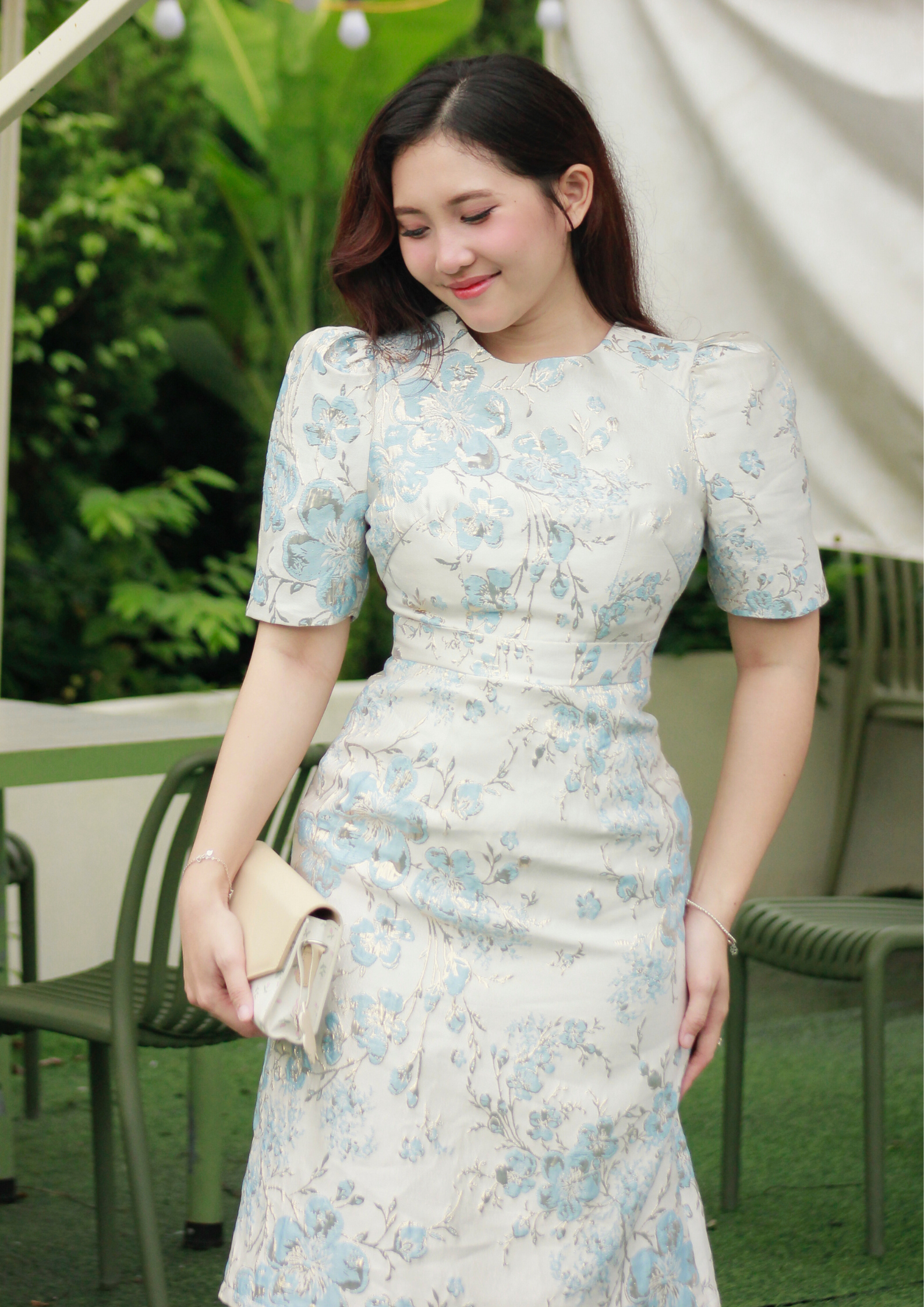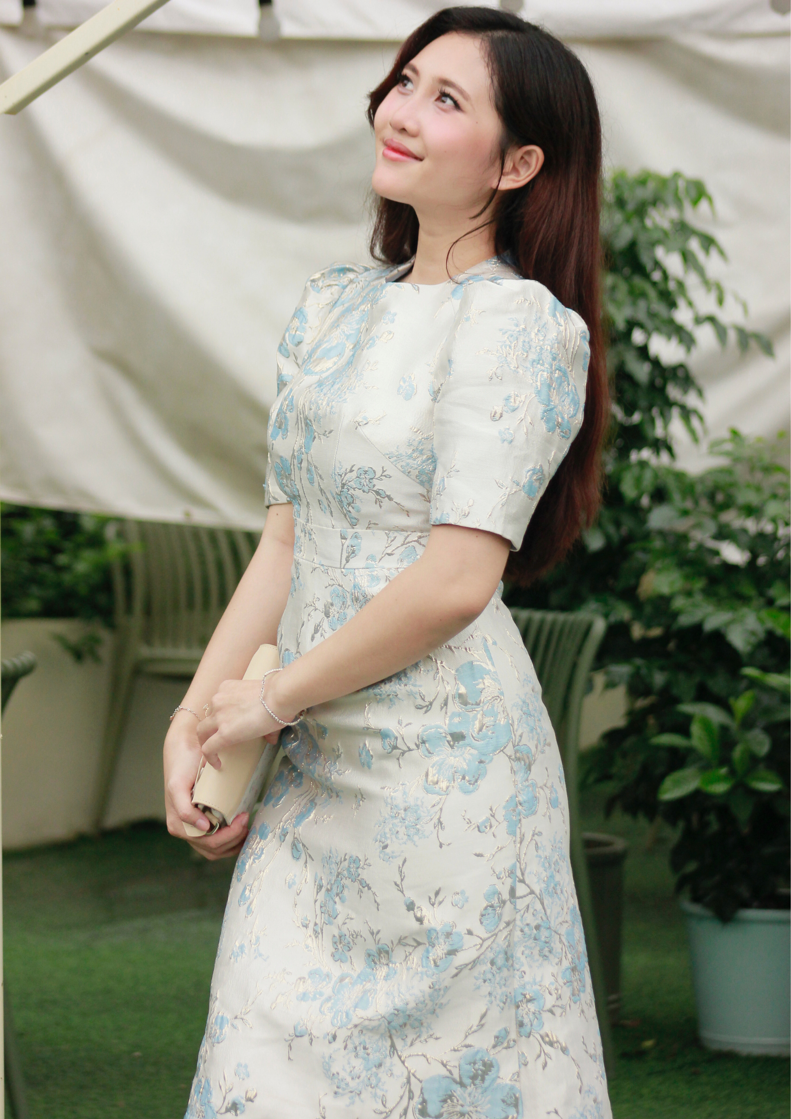 Thiết kế form A nữ tính với cổ tròn kín đáo, tay phồng nhẹ và chiết eo gọn gàng, mang đến vẻ hiện đại nhưng vẫn đầy tinh tế. Khóa kéo ẩn sau lưng giữ sự chỉn chu, tôn trọn đường nét thanh thoát.