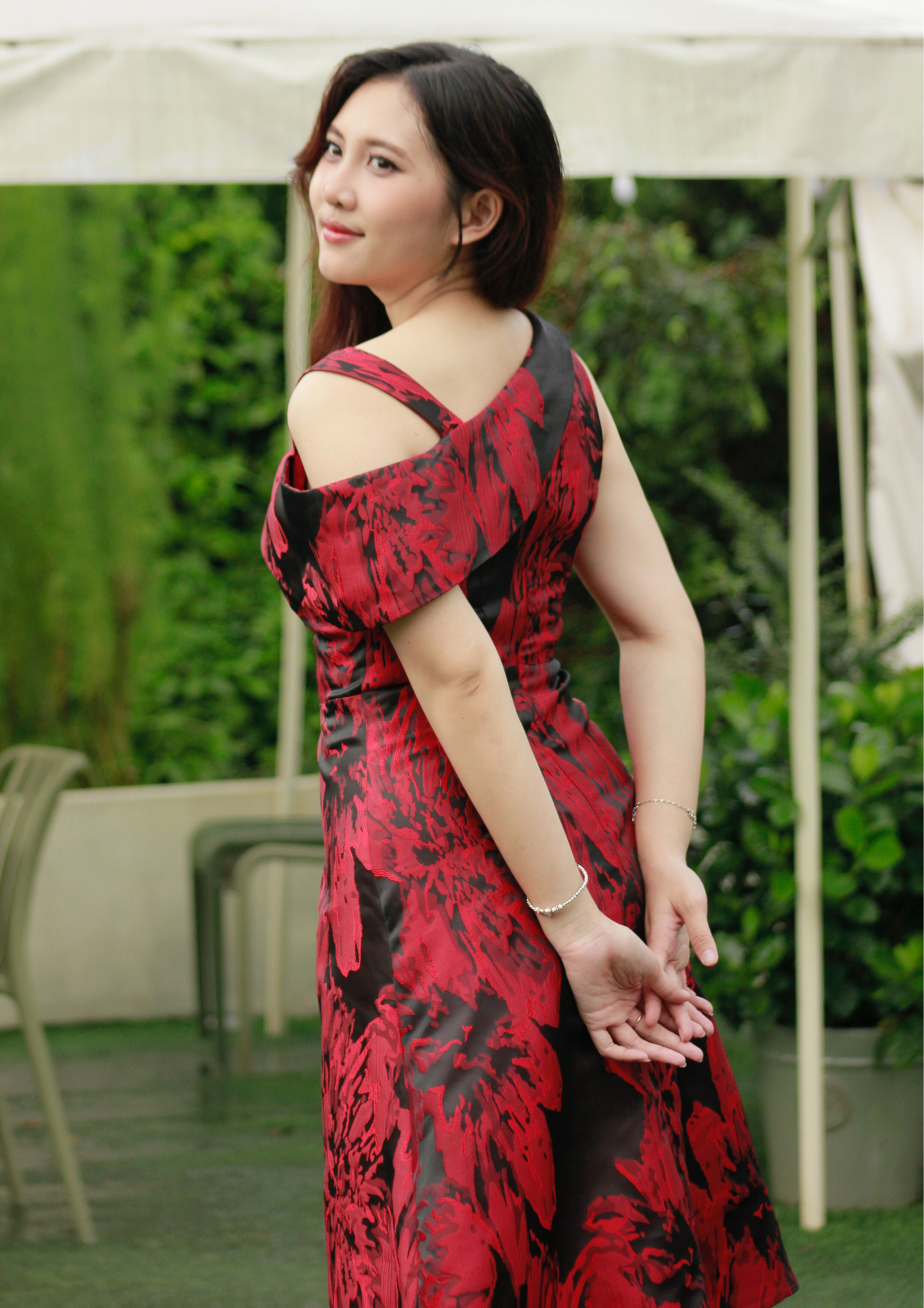 Chất liệu Tafta dệt hoa mẫu đơn với từng cánh hoa nổi nhẹ lên như chạm khắc trên bề mặt vải. Không cần cầu kỳ hay rực rỡ, vẻ đẹp của Peonia nằm ở kết cấu hoa dệt tinh tế - sang trọng đầy khí chất.