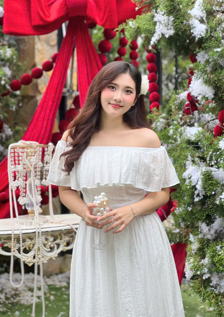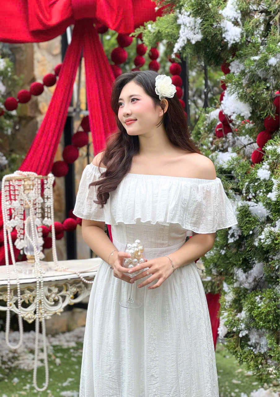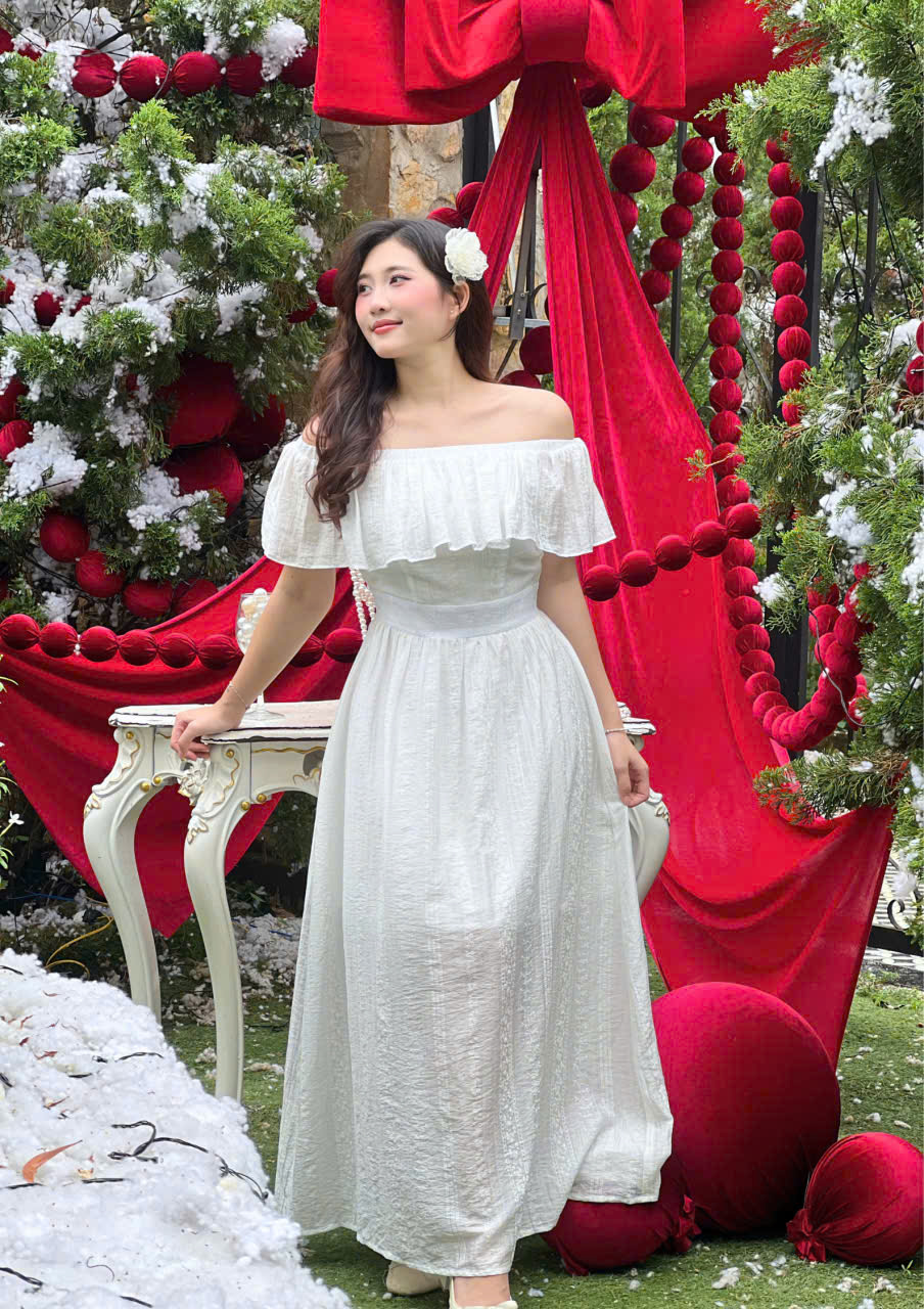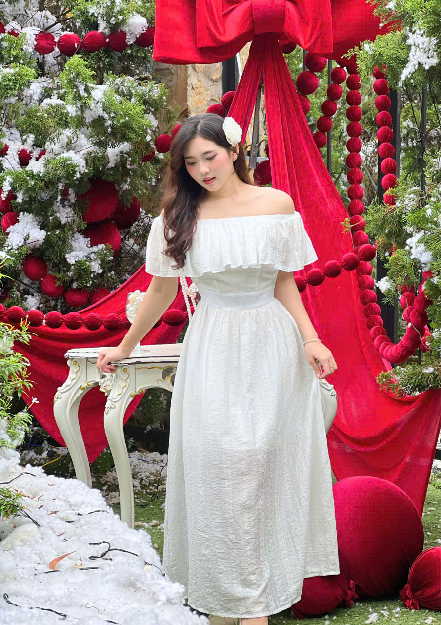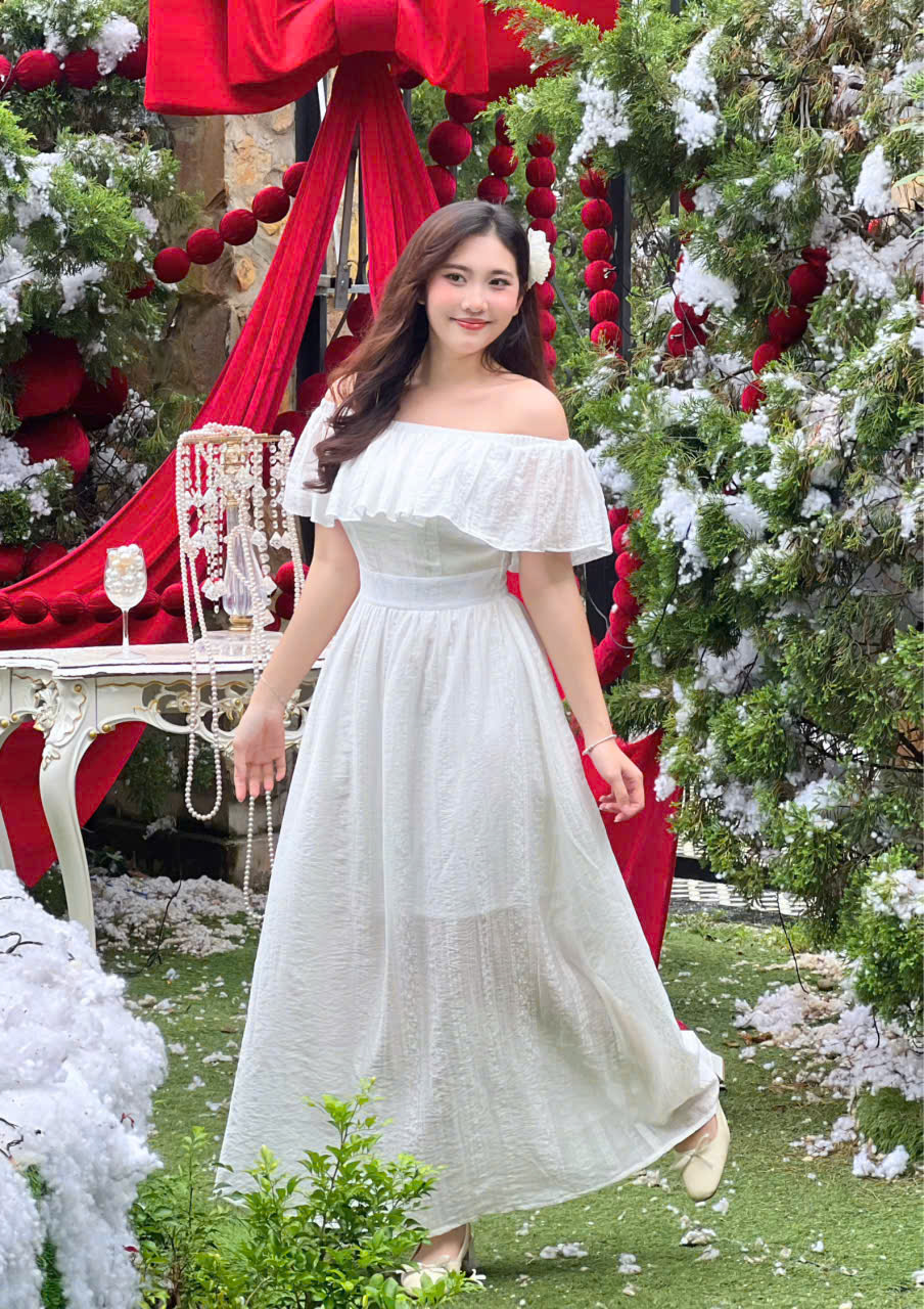 - Thiết kế: Trễ vai phối bèo nhún, nhấn eo nhẹ
