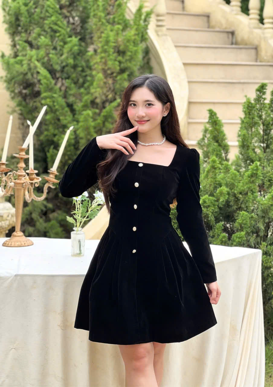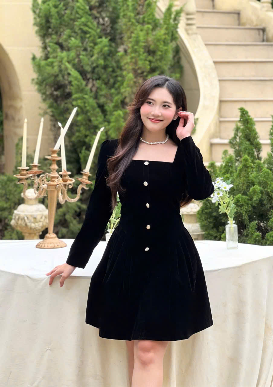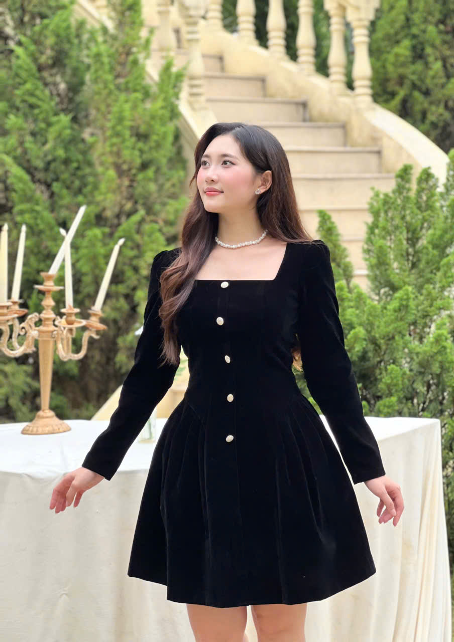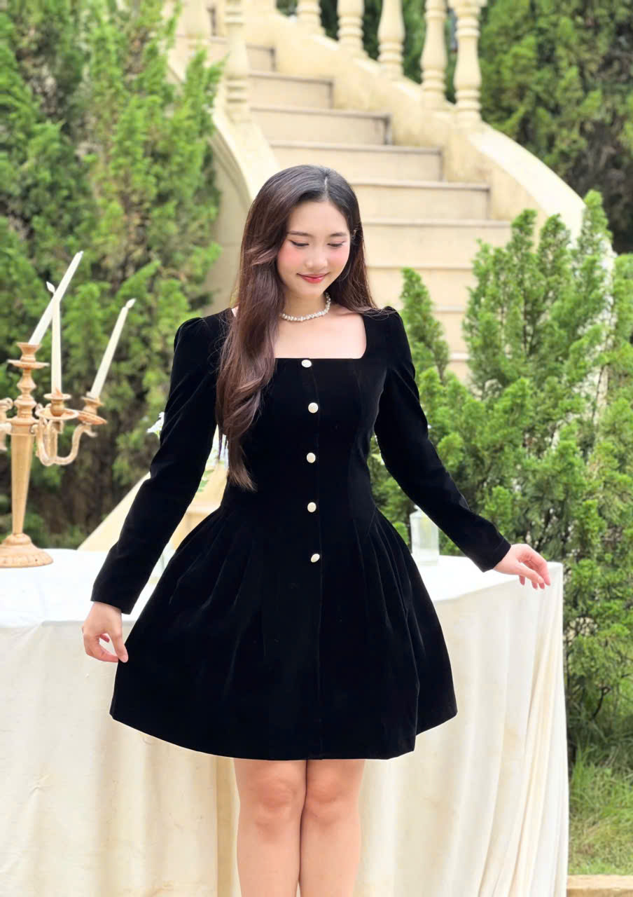 Phần thân trên được tạo phom gọn gàng với cổ vuông tinh tế, kết hợp tay dài mang lại vẻ kín đáo nhưng vẫn mềm mại. Điểm nhấn nằm ở hàng nút giả phía trước cùng chi tiết xếp ly nhẹ, giúp tổng thể thêm phần thanh thoát và tôn dáng. Chất liệu nhung cao cấp tạo hiệu ứng sang trọng, mềm mịn và bắt sáng nhẹ, giúp nàng luôn nổi bật một cách tinh tế.