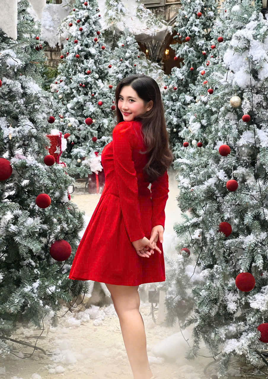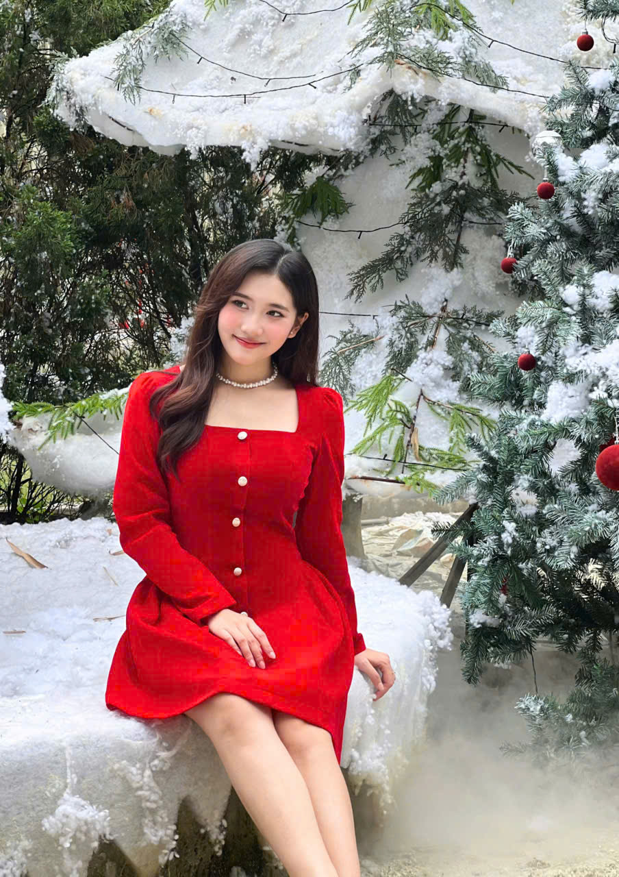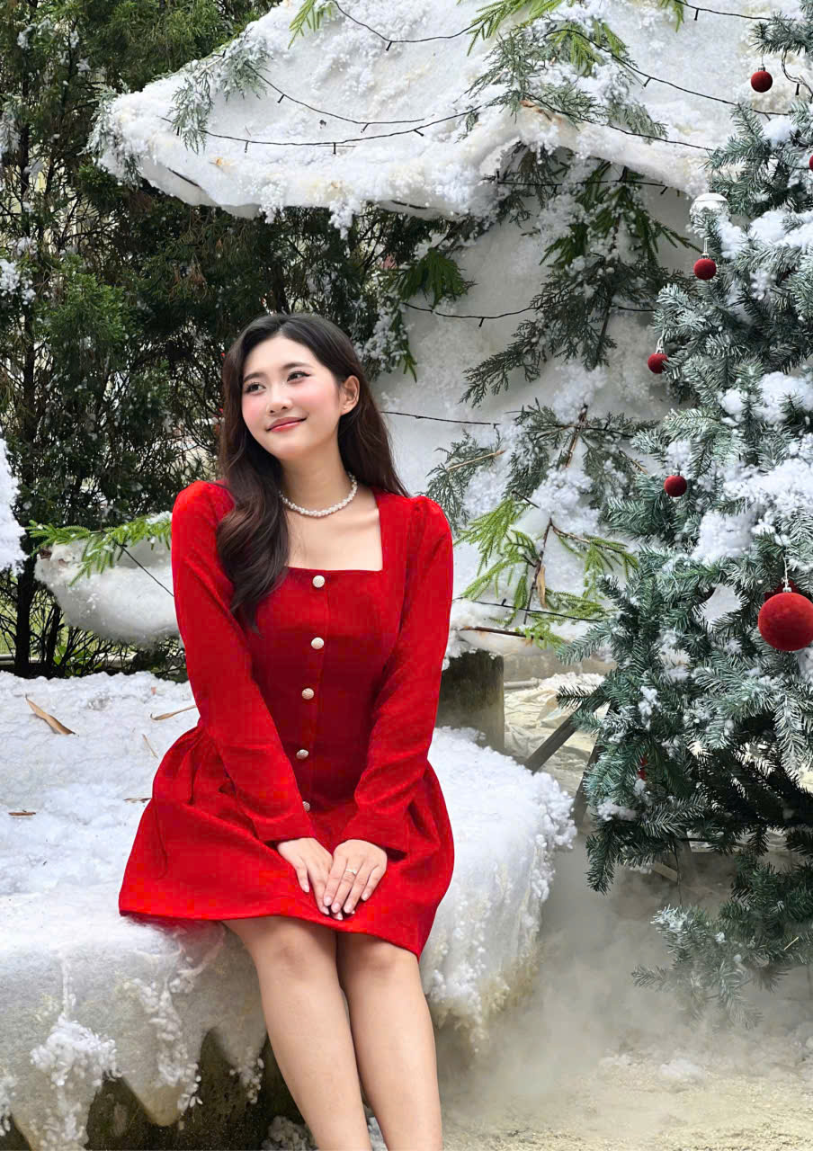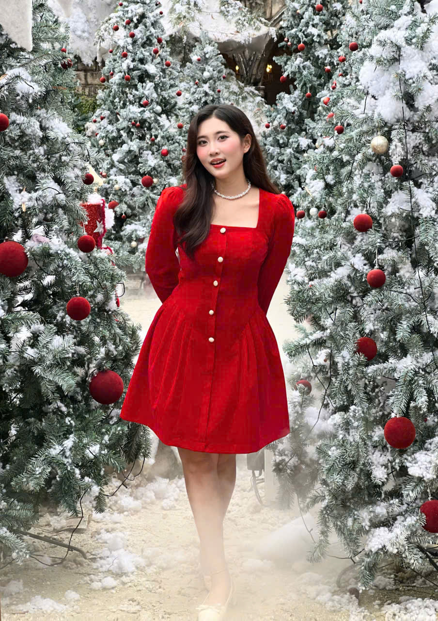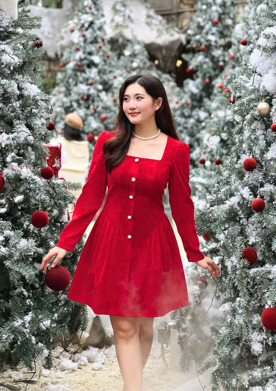 Phần thân trên được tạo phom gọn gàng với cổ vuông tinh tế, kết hợp tay dài mang lại vẻ kín đáo nhưng vẫn mềm mại. Điểm nhấn nằm ở hàng nút giả phía trước cùng chi tiết xếp ly nhẹ, giúp tổng thể thêm phần thanh thoát và tôn dáng. Chất liệu nhung cao cấp tạo hiệu ứng sang trọng, mềm mịn và bắt sáng nhẹ, giúp nàng luôn nổi bật một cách tinh tế.