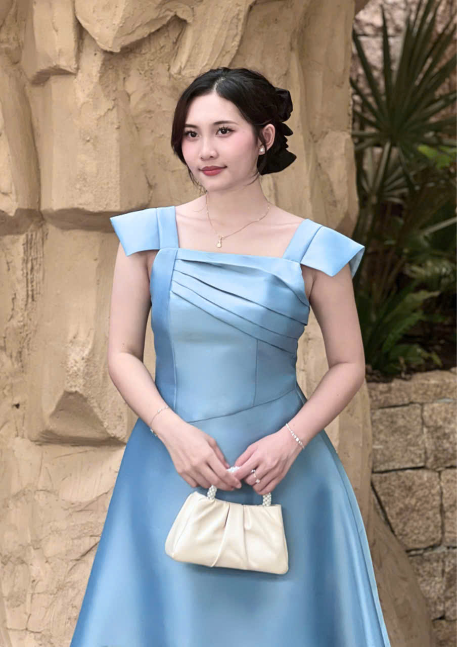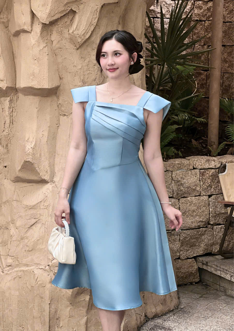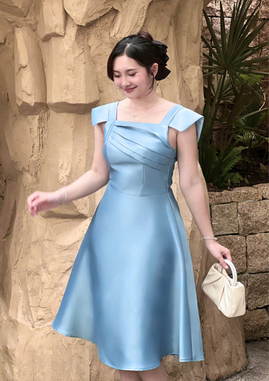 Thiết kế đầm dáng xoè thanh lịch, nhẹ nhàng nhưng vẫn đủ nổi bật cho những dịp đặc biệt. Điểm nhấn nằm ở phần thân trên với các đường xếp ly tinh tế, giúp tạo hiệu ứng thon gọn và tôn dáng khéo léo. Form váy xoè vừa phải mang lại cảm giác mềm mại, nữ tính và thoải mái khi mặc.