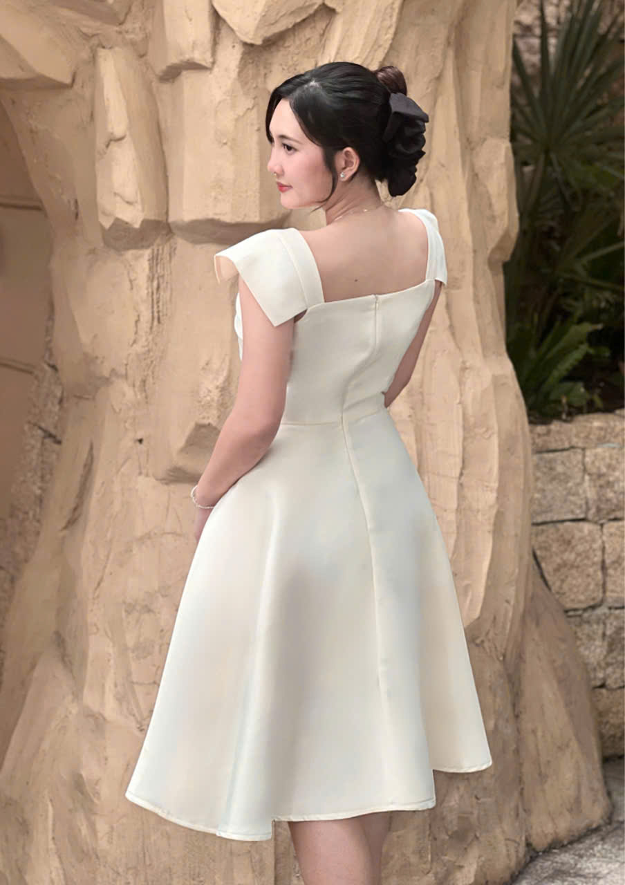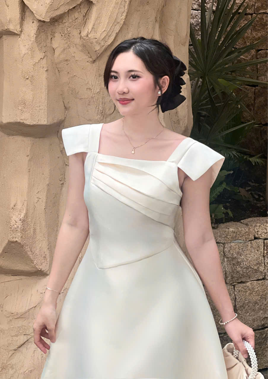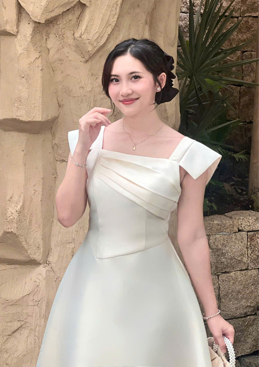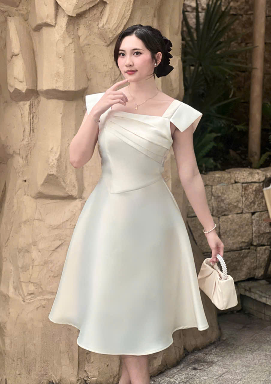 Thiết kế đầm dáng xoè thanh lịch, nhẹ nhàng nhưng vẫn đủ nổi bật cho những dịp đặc biệt. Điểm nhấn nằm ở phần thân trên với các đường xếp ly tinh tế, giúp tạo hiệu ứng thon gọn và tôn dáng khéo léo. Form váy xoè vừa phải mang lại cảm giác mềm mại, nữ tính và thoải mái khi mặc.