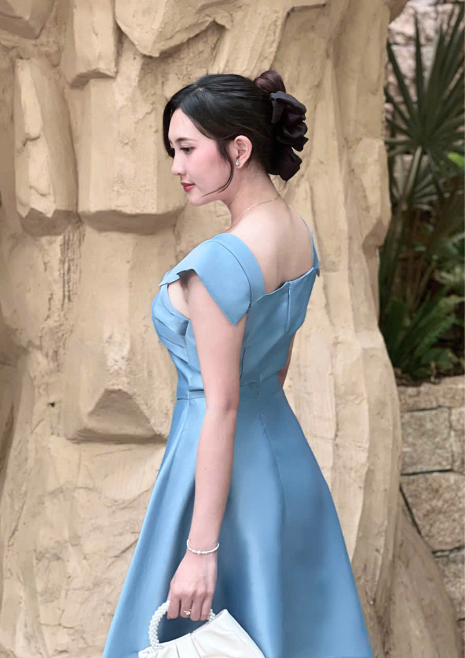 Chi tiết nhấn eo kết hợp đai cùng chất liệu giúp làm nổi bật vòng eo, tạo tổng thể cân đối và thanh thoát. Với hai gam màu kem và xanh dương trang nhã, thiết kế càng thêm phần duyên dáng, phù hợp với phong cách nữ tính hiện đại.